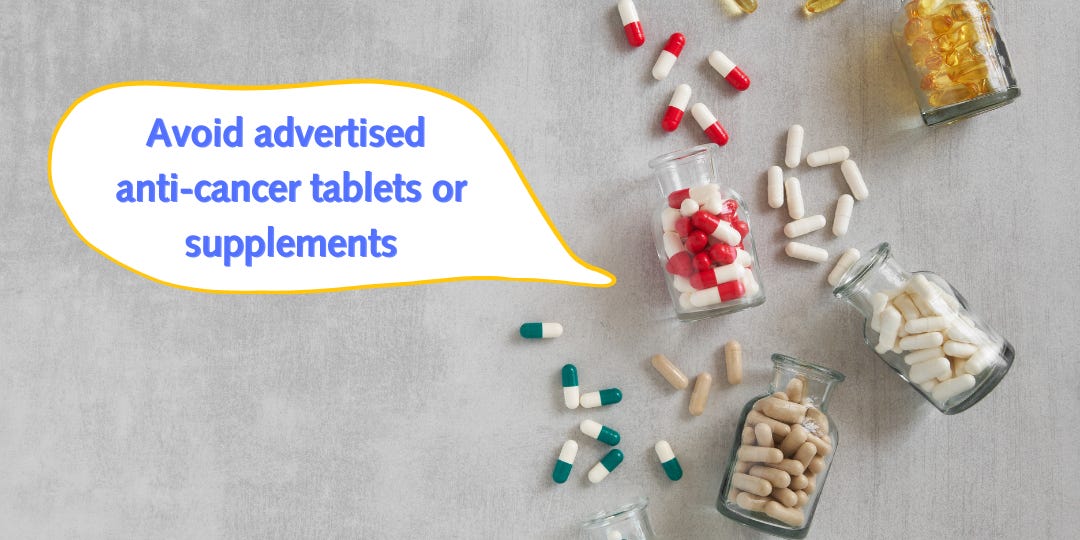 💊 Avoid advertised anti-cancer tablets or supplements,