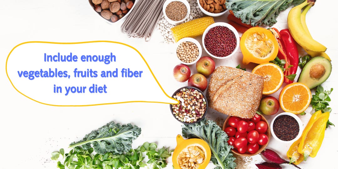 🥗 Include enough vegetables, fruits and fiber in your diet,