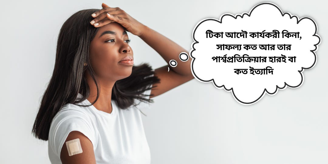 তাই আমরা দেশ জুড়ে ফোনের রিং টোনে শুনতে চাইনা নতুন অসুখের টিকা 'Totally safe' । আমরা চাই নির্ভরযোগ্য নেতার অকপট উক্তি যে 'ঝুঁকি শূন্য কিছু হয় না। তবু আপনারা টিকা নিন, কারণ অসুখের ঝুঁকি , টিকার ঝুঁকি থেকে অনেক বেশি’। টিকা নিয়ে দেশ, দশ আর আপনার অর্থনৈতিক ভবিষ্যৎকে আপনিই পারেন রক্ষা করতে।