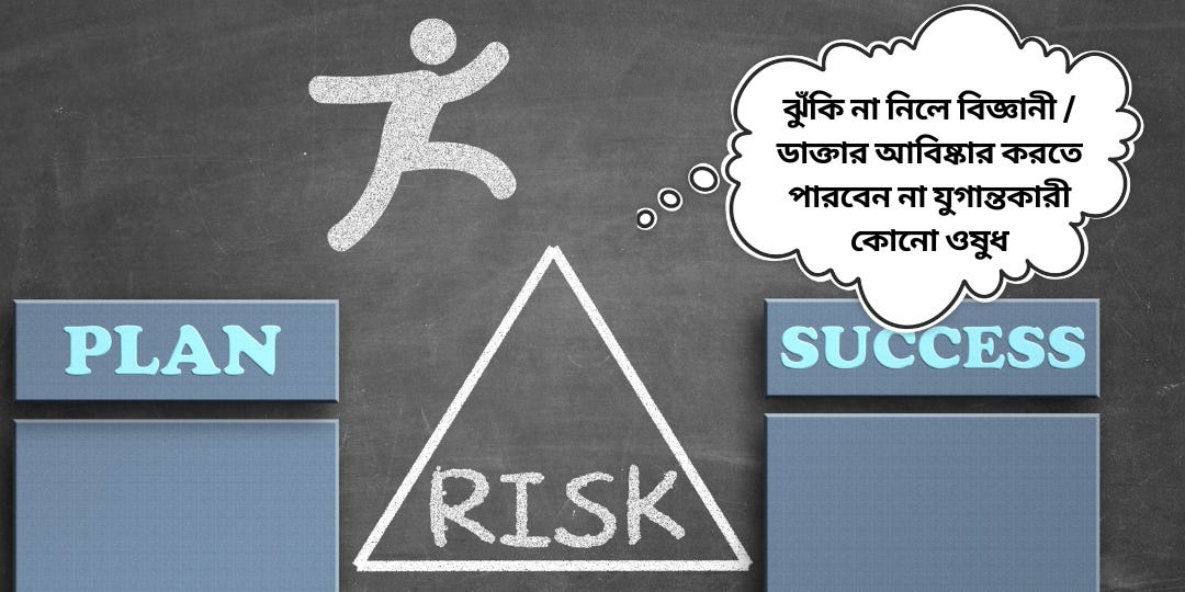 ঝুঁকি না নিলে বিজ্ঞানী / ডাক্তার আবিষ্কার করতে পারবেন না যুগান্তকারী কোনো ওষুধ। আবার এদিকে নিজেকে নিয়ে ঝুঁকি নেবার ক্ষমতা না থাকলে রুগী / রোগিনী কোনো ভালো চিকিৎসা নিতেই পারবেন না। তবে ঝুঁকি যেন লুকিয়ে, চাপিয়ে না দেওয়া হয়। এক হাসপাতালে ঝুঁকির কথা বললে, রুগী যে হাসপাতালে ঝুঁকি লুকিয়ে চিকিৎসা চলছে তিনি চলে যাবেন সেই দিকেই।