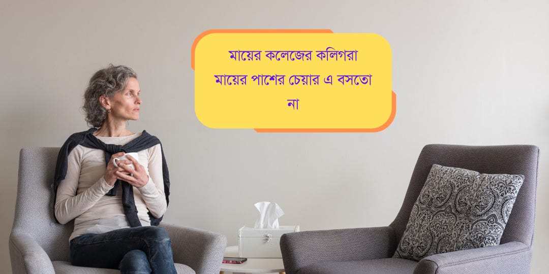 মায়ের কলেজের কলিগ রা মায়ের পাশের চেয়ার এ বসতো না। শঙ্করদার বৌভাতে টিকলি যখন মায়ের কোলে উঠেছিল তখন সুধামাসী নিজের মেয়ে কে মায়ের কোল থেকে ছিনিয়ে নেয়নি? এক প্যান্ডেল লোকের সামনে মা কে অপমান করেছিল যে ক্যান্সারের রুগী হয়ে কেন বাচ্চাকে কোলে নেওয়া ? কেউ প্রতিবাদ করেনি।