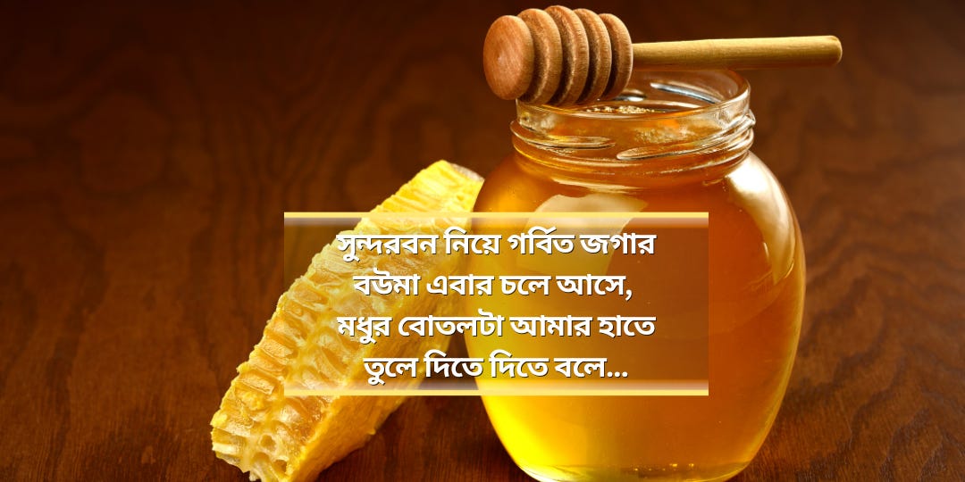 দুদিন আগে সুন্দরবনে বেড়াতে গিয়ে আসল মধু খুঁজতে গিয়ে বেফাঁস কথা বলে ফেলেছি। হোটেলের পাশে স্থানীয় বাজারে শ্বশুর আর বউমার। শ্বশুরের নাম জগা। জগন্নাথ। সুপার স্পেশালাইসড দোকান। শুধু মধু। আর হ্যাঁ সন্ধ্যায় একটু চা।