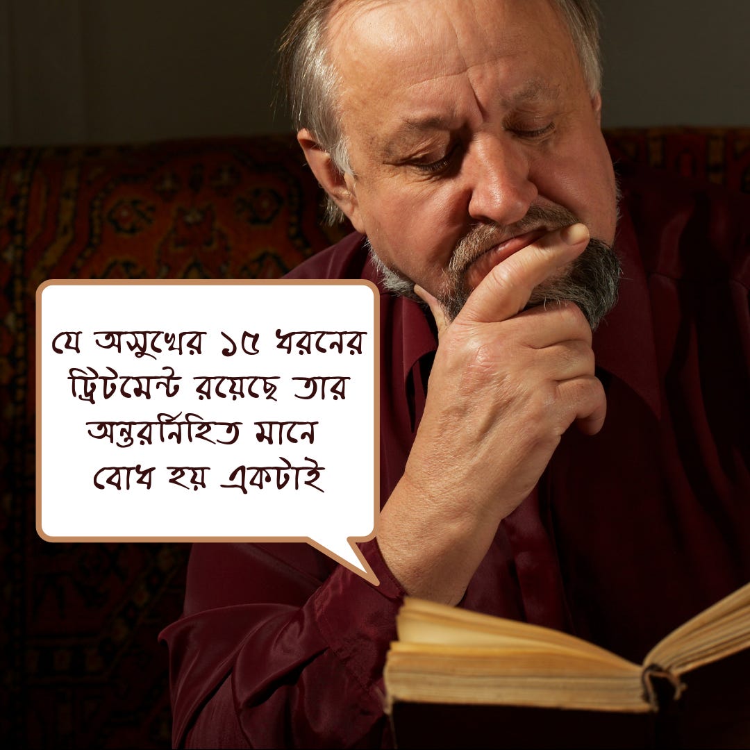 এই প্রসঙ্গে আমাদের এক সিনিয়র সার্জেন ডঃ আশীষ বসাকের একটা উক্তি মনে পড়ে যায়। উনি বলেন যে যে অসুখের ১৫ ধরনের ট্রিটমেন্ট রয়েছে তার অন্তরর্নিহিত মানে বোধ হয় একটাই। তা হলো পনেরোটার কোনটাই একদম সন্তোষজনক ট্রিটমেন্ট করতে পারদর্শী নয়।