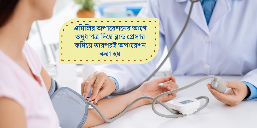 👉🏾 অল্প বয়সে এইরকম আকাশছোঁয়া ব্লাড প্রেসার এর কারণ অনেক সময় কিডনিতে লুকিয়ে থাকে। এদিকে কিডনির স্ক্যান করতে গিয়েই ডাক্তারদের নজরে পড়ে যায় পেটের মধ্যে লুকিয়ে থাকা এক বড়সড় টিউমার। এমিলিকে রেডি করে গাইনোকলজিস্ট অপারেশন করলেন। এমিলির অপারেশনের আগে ওষুধ পত্র দিয়ে ব্লাড প্রেসার কমিয়ে তারপরই অপারেশন করা হয় যাতে এমিলির স্ট্রোক বা এই ধরনের কোন কমপ্লিকেশন না হয়।