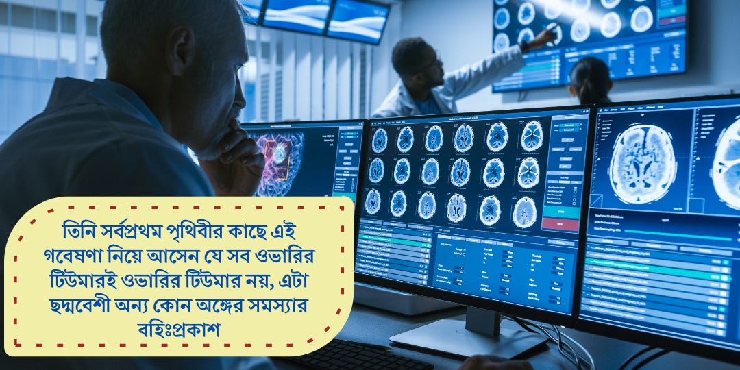 👉🏾 উনি আমাদের শিখিয়েছিলেন ওভারির টিউমারের উৎপত্তি শুধু ওভারি থেকে হয় না। গলা, ফুসফুস এমনকি ব্রেস্ট থেকেও উৎপত্তি হতে পারে ছদ্মবেশী তলপেটের ওভারির টিউমারের।