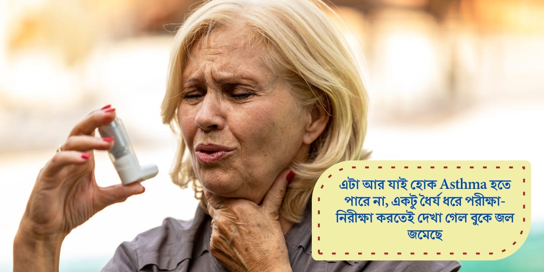 👉🏾৬৫ এর আরতি গোস্বামীর বাড়ি আসানসোলে। আমি ইংল্যান্ড থেকে ফিরে আসার পরপরই ওনাকে দেখেছিলাম আমার ক্লিনিকে। নাতনি জোর করে ওনাকে ধরে নিয়ে আসে। শুনলাম বছর দেড়েক আগে থেকেই ওনার ট্রিটমেন্ট চলছে হাঁপানির সমস্যার জন্য। Asthma প্রবলেমের জন্য এ দোকান সে দোকান থেকে ওষুধপত্র-ইনহেলার এনে, চলছিল, বছরের ওপর।