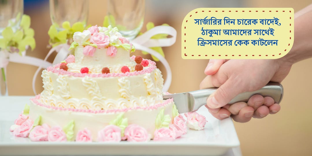 👉🏾 ওষুধ পত্র দিয়ে অসুখটা একটু কন্ট্রোল করে সার্জারি হলো মাস আড়াই বাদে। সার্জারির দিন চারেক বাদেই, ঠাকুমা আমাদের সাথেই ক্রিসমাসের কেক কাটলেন। তখন তিনি হাসপাতালে। তারপরে ফিরে গেলেন আসানসোলে, ৬ বছর হয়ে গেল এখন উনি ভালোই আছেন।