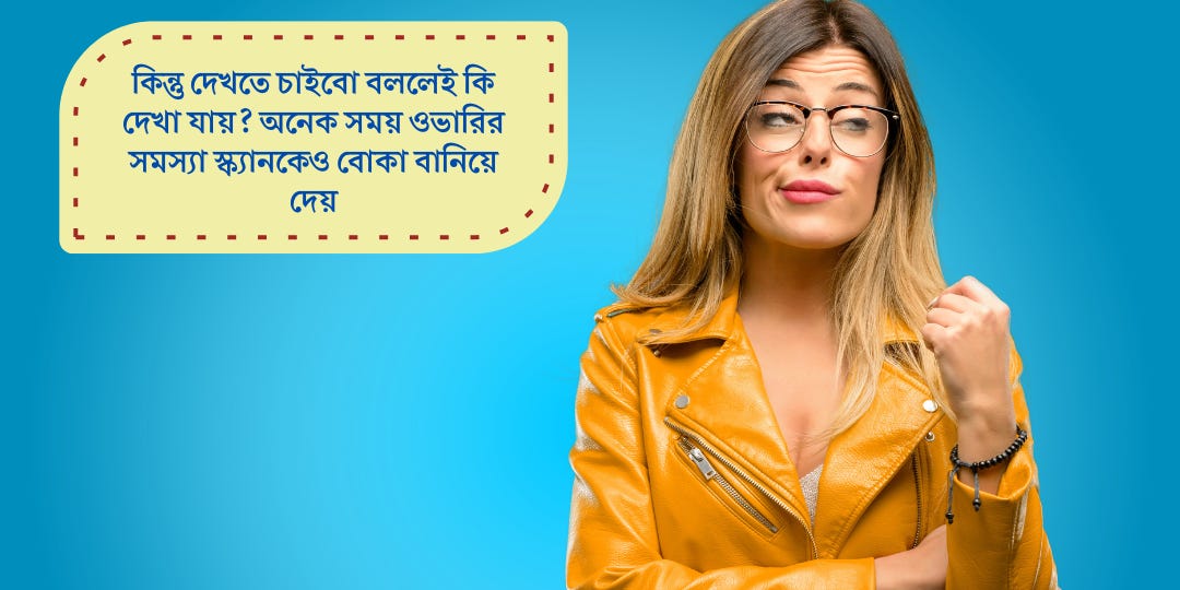 👉🏾 কিন্তু আজকে এতগুলো দশক কাটিয়ে আসার পরে জেনেছি ওভারি দেখার সাথে সাথে ওভারির বাইরের অর্গান গুলো দেখা, আরো বেশি গুরুত্বপূর্ণ। কিন্তু দেখতে চাইবো বললেই কি দেখা যায়? অনেক সময় ওভারির সমস্যা স্ক্যানকেও বোকা বানিয়ে দেয়।
