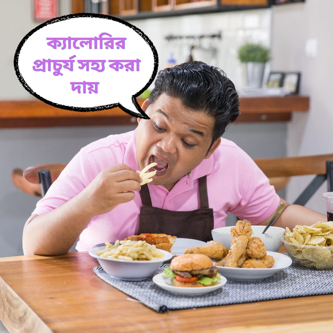 এখন খাবারের প্রাচুর্যে, শহুরে জীবনযাত্রায়, হাই ক্যালরির খাবার জুটছে সহজেই। মন্বন্তরে পাল্টে যাওয়া আমাদের শরীরের জেনেটিক প্রোফাইল এই ক্যালোরির প্রাচুর্য সহ্য করতে পারছে না, ফলে বাড়তি ক্যালোরি থিতিয়ে পড়ছে ফ্যাট হিসেবে।