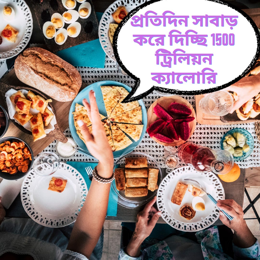 আর আজকে পৃথিবীতে যত মানুষ রয়েছি আমরা, তারা প্রতিদিন সাবাড় করে দিচ্ছি 1500 ট্রিলিয়ন ক্যালোরি।