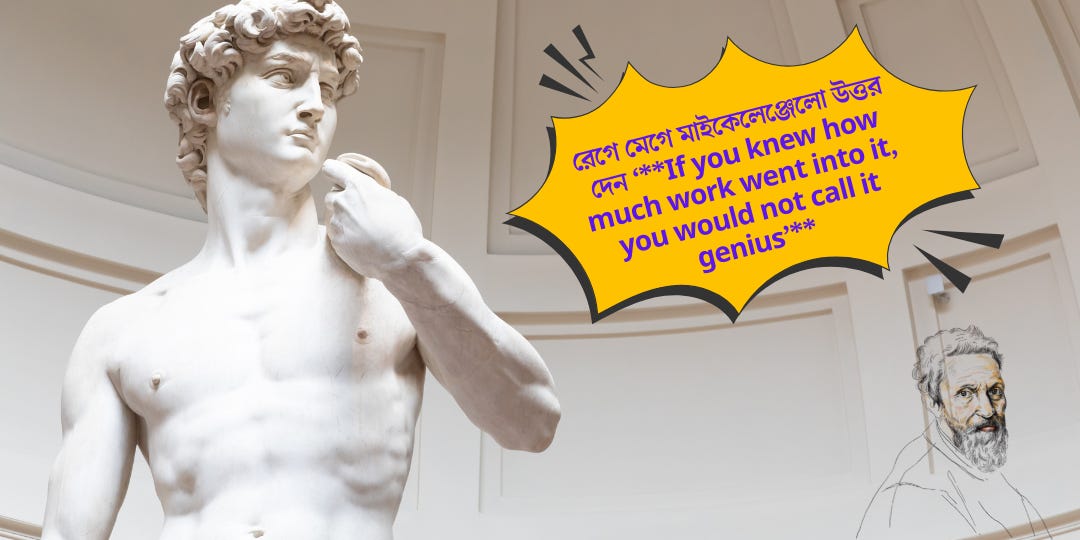 āĻļā§āύāĻž āϝāĻžāϝāĻŧ, āĻāĻāϏāĻŽāϝāĻŧ āĻāύāĻŋ āĻļā§āύā§āύ āϝā§, āĻāύāĻžāĻā§ āύāĻžāĻāĻŋ âāĻāĻŋāύāĻŋāϝāĻŧāĻžāϏâ āĻŦāϞāĻž āĻšāϝāĻŧā§āĻā§āĨ¤ āϰā§āĻā§ āĻŽā§āĻā§ āĻŽāĻžāĻāĻā§āϞā§āĻā§āĻā§āϞ⧠āĻāϤā§āϤāϰ āĻĻā§āĻ¨Â â**If you knew how much work went into it, you would not call it geniusâ**.