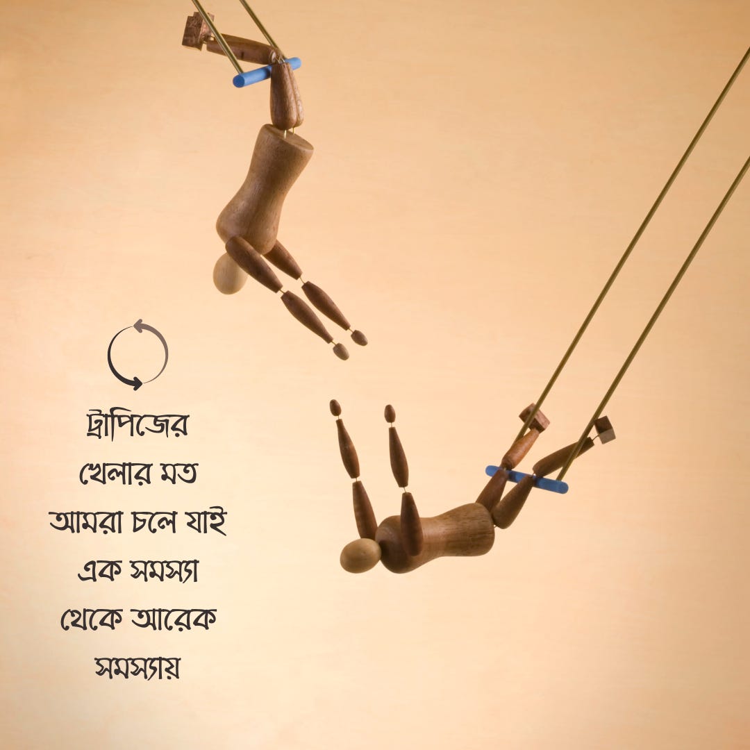 ট্রাপিজের খেলার মত আমরা চলে যাই এক সমস্যা থেকে আরেক সমস্যায়। ঝাঁপ দিয়ে যেতে যেতে ঢাকা পড়ে থাকে পুরনো অমীমাংসিত সমস্যা, যার দিকে নজর দেওয়া উচিত ছিল বহুদিন আগেই।