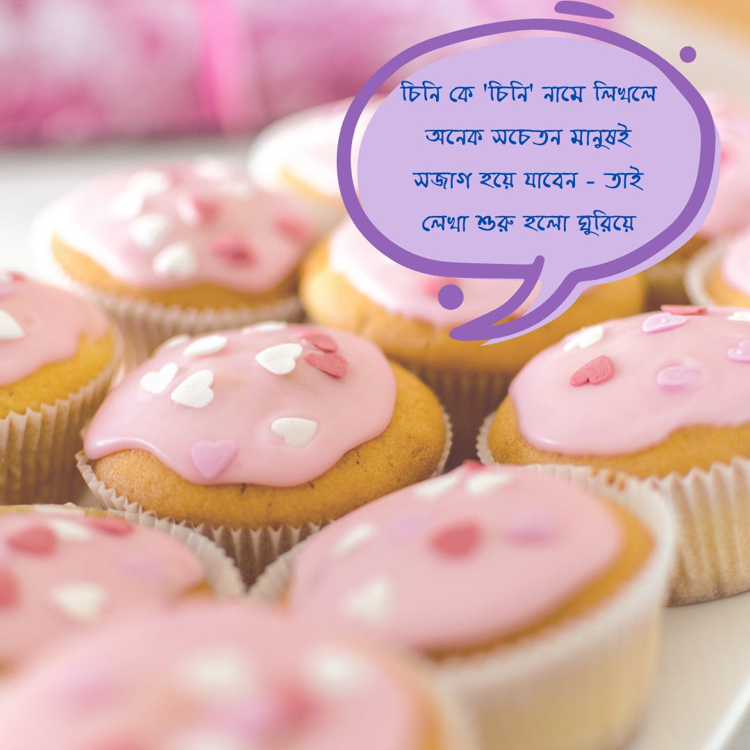 কিন্তু চিনির এত নাম কেন? উদ্দেশ্য একটাই - চিনি কে 'চিনি' নামে লিখলে অনেক সচেতন মানুষই সজাগ হয়ে যাবেন - তাই লেখা শুরু হলো ঘুরিয়ে- যাতে আমার আপনার মতো গ্রাহক ধোঁকা খেয়ে যান!