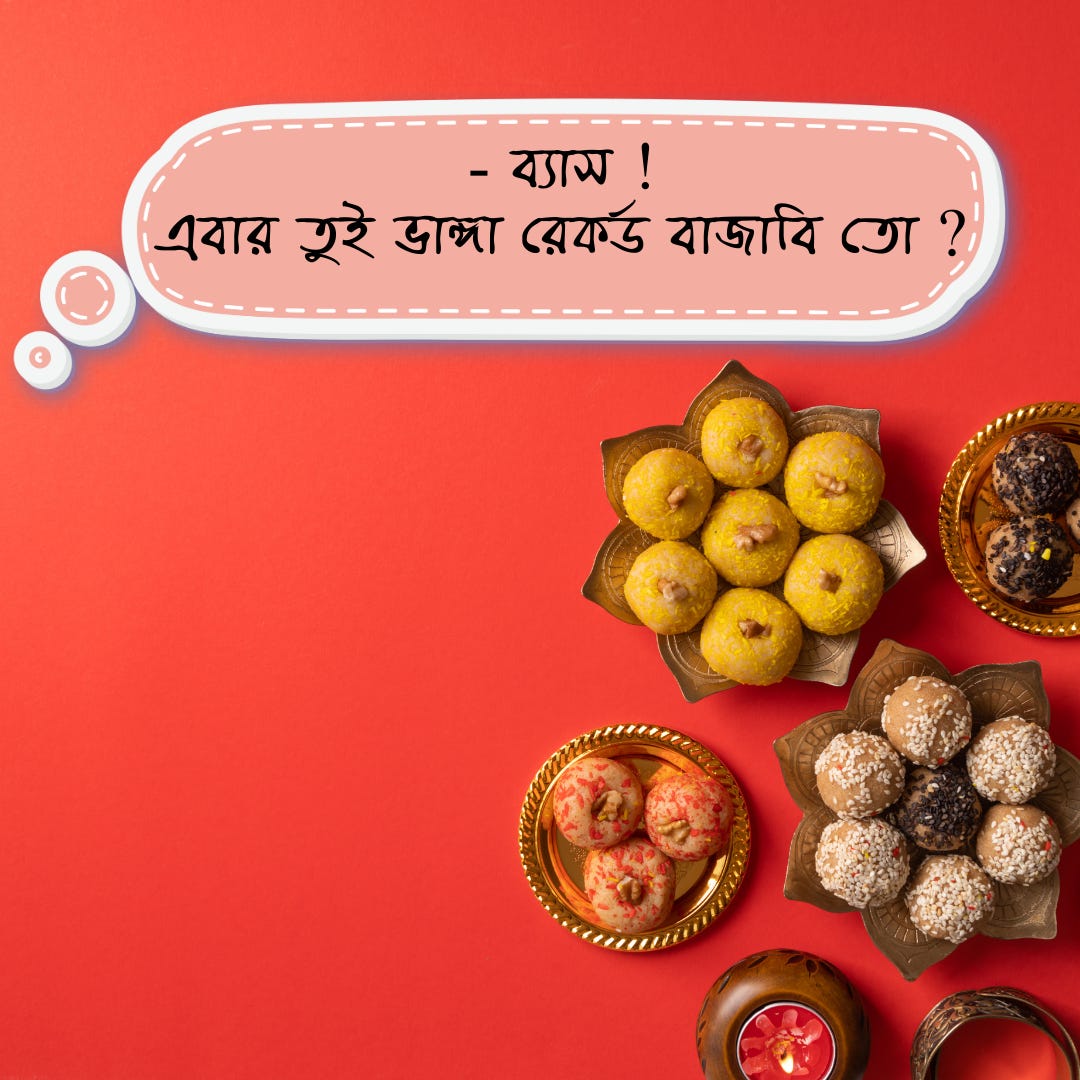 - ব্যাস এবার তুই ভাঙ্গা রেকর্ড বাজাবি তো ? নিয়মিত ব্যায়াম, ভেজিটেবেল খাওয়া, উনুনে না দেওয়া টক ফল খেতে হবে। জীবনের সব আনন্দ ছেড়ে দিতে হবে। রামকৃষ্ণের অত ভালো রাবড়ি, আরসালানের বিরিয়ানি, ক্রিসমাস কেক সব বন্ধ।