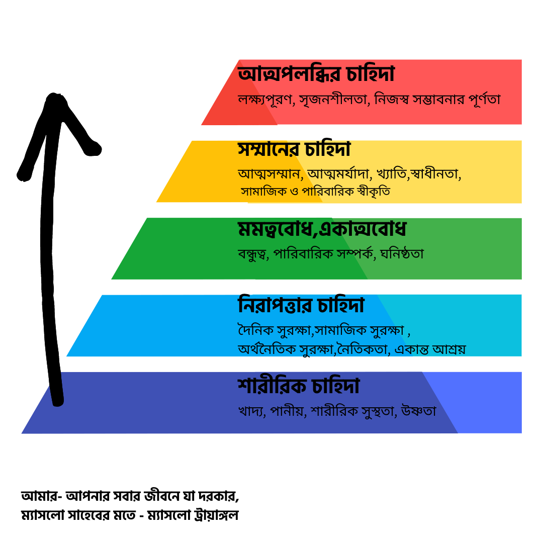 আমাদের স্কুলে কলেজে এই ম্যাসলো ট্রায়াঙ্গেল পড়ানো হয়নি। অথচ আমরা প্রত্যেকে মানুষ। এই আউট অফ সিলেবাস ম্যাসলো ট্রায়াঙ্গেল আজ থেকেই আলমারির পাশে বা দরজার পেছনে আঠা দিয়ে লাগিয়ে প্রায়ই রিভাইজ দিতে হবে। যেদিন দরকার সেদিন পড়লে চলবে না। মাধ্যমিক পরীক্ষার প্রস্তুতি পরীক্ষার দিন করলে হয় না।