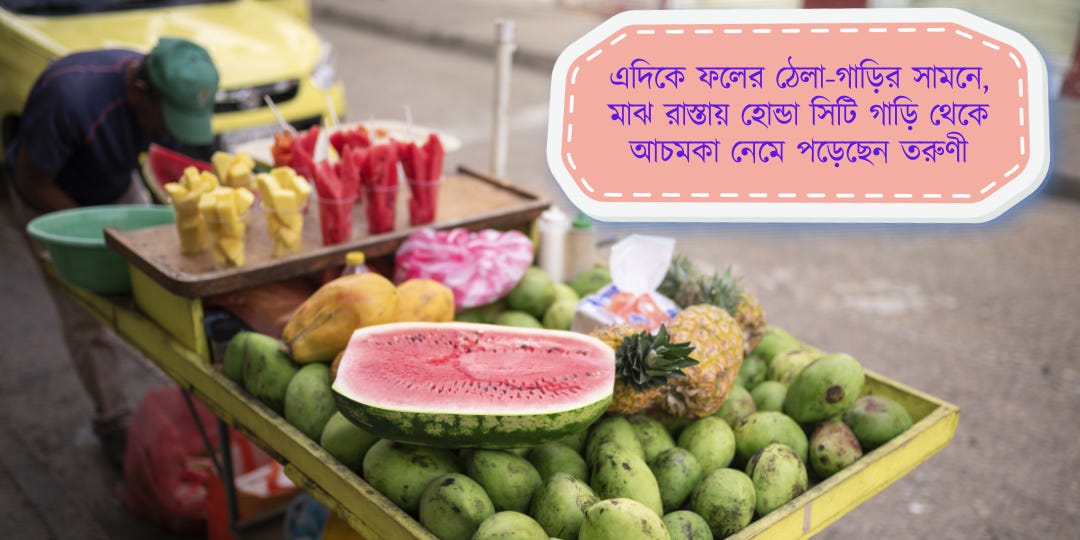 এদিকে ফলের ঠেলা-গাড়ির সামনে, মাঝ রাস্তায় হোন্ডা সিটি গাড়ি থেকে আচমকা নেমে পড়েছেন তরুণী। মনে হচ্ছে ব্রাদারকে টার্গেট করেই। দুজনের মুখেই মাস্ক।