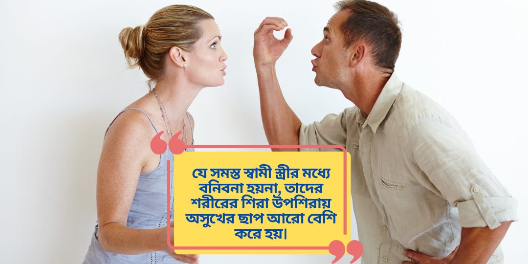 👉🏽 University of Utah -র ডক্টর স্মিথ অংক কষে দেখিয়ে দিলেন যে, যে সমস্ত স্বামী স্ত্রীর মধ্যে বনিবনা হয়না, সারাদিন মনোমালিন্য চলতে থাকে, তাদের শরীরের শিরা উপশিরায় অসুখের ছাপ আরো বেশি করে হয়। ( ‣ )