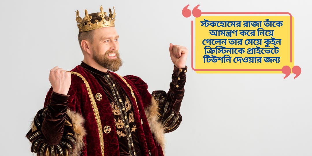 👉🏽 রুলস ফর দি ডাইরেকশন অফ দি মাইন্ড বই লিখে ডেকার্ট যখন খ্যাতির শীর্ষে, স্টকহোমের রাজা তাঁকে আমন্ত্রণ করে নিয়ে গেলেন তার মেয়ে কুইন ক্রিস্টিনাকে প্রাইভেটে টিউশনি দেওয়ার জন্য।