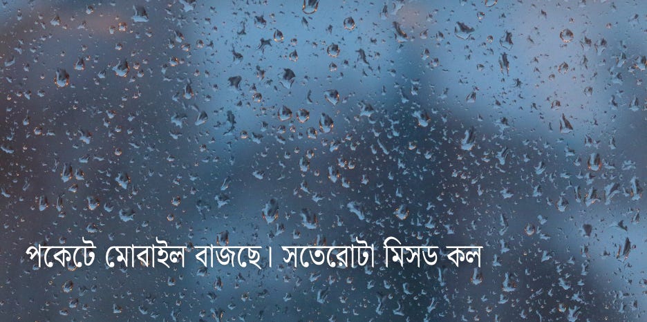 মাসি শুনে খুশি হয়। ফোনটা রেখে দেয়। অ্যাপয়েন্টমেন্টের দুদিন আগে তুমুল বৃষ্টির মধ্যে গাড়ি চালিয়ে, কোনোমতে গাড়ি পার্ক করে হাতের ব্যাগটাকে আড়াআড়িভাবে মাথার ওপর দিয়ে বৃষ্টিটাকে আড়াল করে মাথাটা বাঁচিয়ে দৌড়াচ্ছি। পকেটে মোবাইল বাজছে। সতেরোটা মিসড কল। গোপালের চায়ের দোকানে আশ্রয় নিই।