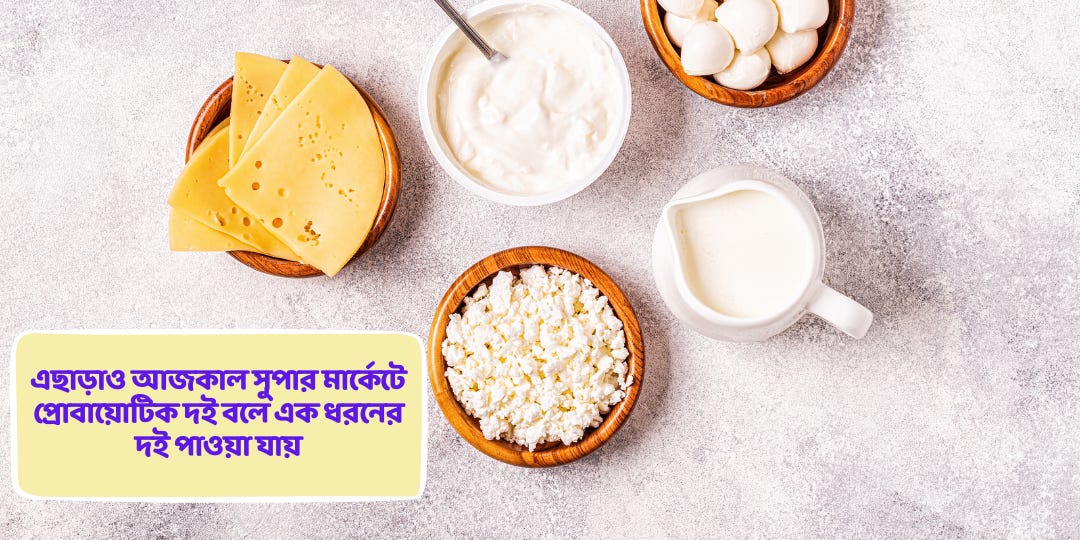 এছাড়াও আজকাল সুপার মার্কেটে প্রোবায়োটিক দই বলে এক ধরনের দই পাওয়া যায়। কিছু সময় ক্যাপসুলেও এ ধরনের প্রোবায়োটিক মেলে। শরীরের অনেক সমস্যা নিরাময়ে এরা খুব ভালো কাজ দেয়।