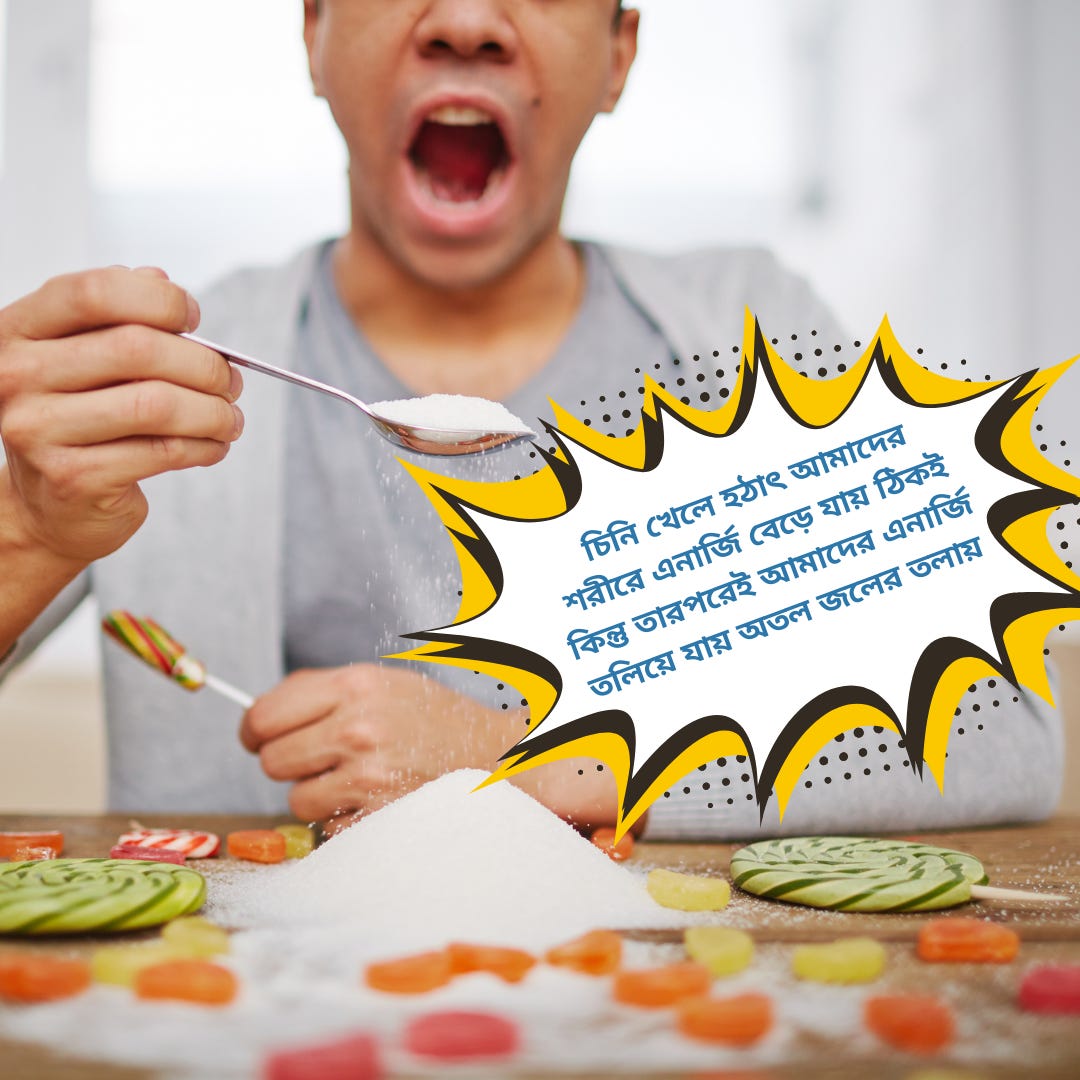 👉🏾 চিনি আমাদের দীর্ঘ মেয়াদে স্বাস্থ্যের জন্য ক্ষতিকর। চিনি খেলে হঠাৎ আমাদের শরীরে এনার্জি বেড়ে যায় ঠিকই কিন্তু তারপরেই আমাদের এনার্জি তলিয়ে যায় অতল জলের তলায়। আমরা হয়ে পড়ি নিস্তেজ। আসবে ডিপ্রেশন। ফল শাকসবজি খান দিনে ৫ পোর্শন। নরমাল আকৃতির ফল এক পোর্শন মানে একটা। ছোট ফলের এক পোর্শন এক মুঠো ফল। আর তরিতরকারির এক পোর্শন মানে রান্না হওয়ার পর এক মুঠো তরকারি।