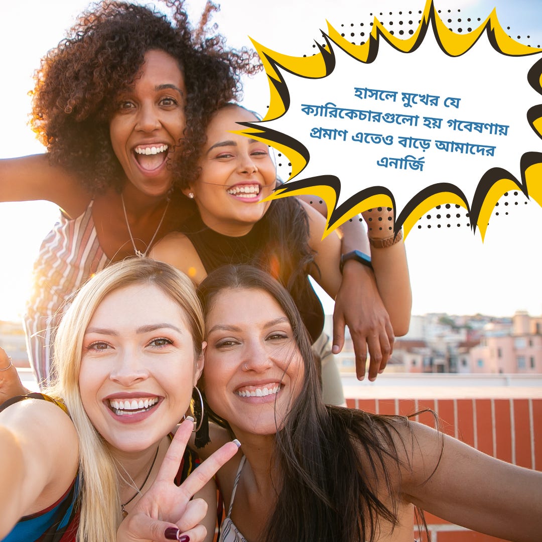 ১৬ ধরনের হাসি হাসে মানুষ। হাসলে ব্রেন থেকে বের হয় endorphins বলে হ্যাপি হরমোন। হার্টের রক্ত সরবরাহ বাড়ে। শরীরে কমে প্রদাহ। হাসলে মুখের যে ক্যারিকেচারগুলো হয় গবেষণায় প্রমাণ এতেও বাড়ে আমাদের এনার্জি। সাধারণ জীবনের বিভিন্ন ঘটনায় আমরা যেমন হাসি সেটাই সবথেকে ভালো। কিন্তু অতটা হাস্যকর জীবন আপনার যদি না থাকে তাহলেও পরোয়া নেই। আজকালকার দিনে স্ট্যান্ড আপ কমেডি বা হাসির কোন বই পড়ে হাসাটাও, বাড়াতে সাহায্য করবে এনার্জি।