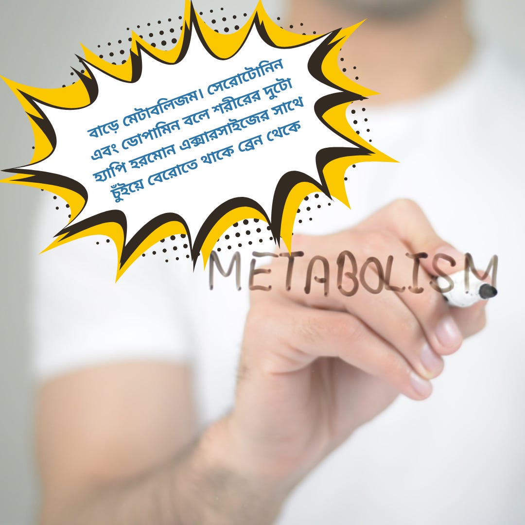 শরীর পায় নতুন প্রাণ। বাড়ে মেটাবলিজম। সেরোটোনিন এবং ডোপামিন বলে শরীরের দুটো হ্যাপি হরমোন এক্সারসাইজের সাথে চুঁইয়ে বেরোতে থাকে ব্রেন থেকে।