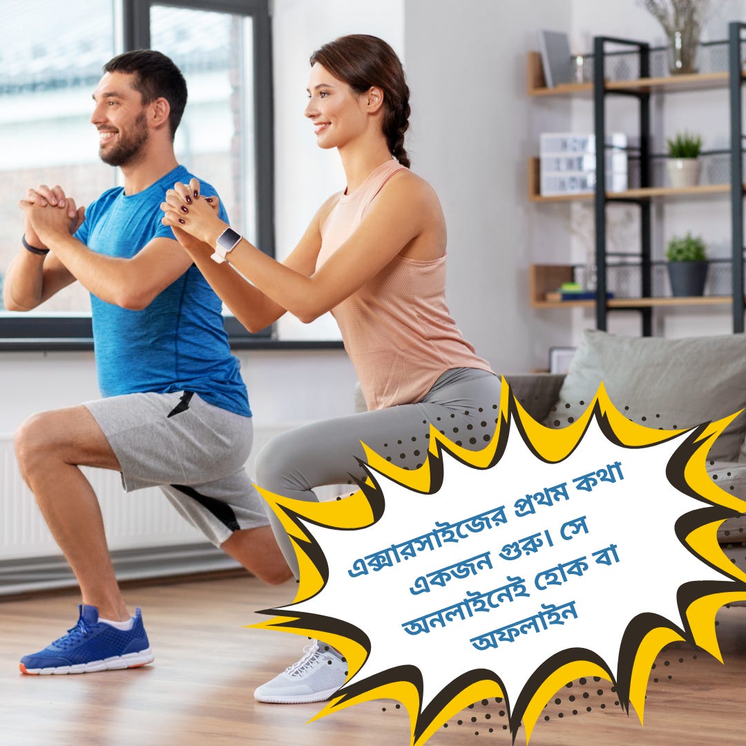 🧮 অংকের আসল ফর্মুলাটা: এক্সারসাইজ করলে তবেই ভালো থাকবেন। উল্টোটা নয়। ছোট করে শুরু করুন। প্রথম প্রথম দৈনিক 10 মিনিট। অ্যারোবিক এক্সারসাইজ সবচেয়ে ভালো, না করতে পারলে সাঁতার, নাচ, সাইকেলে চড়া, হাইকিং বা উঁচু জায়গা থেকে একটু ঘুরে আসা। এগুলোও চলতে পারে।👉🏾 এক্সারসাইজ শুরু করার আগে জামা, ইনার, জুতো পাল্টে নিন। কানে বাজুক একটা মিউজিক। যাতে আছে ছন্দ। ভালো এক্সারসাইজের প্রথম কথা একজন গুরু। সে অনলাইনেই হোক বা অফলাইন। গুরু আর আপনার ক্লাসের অন্য সদস্যদের দেখে আপনার এক্সারসাইজের সাফল্য বাড়বে।