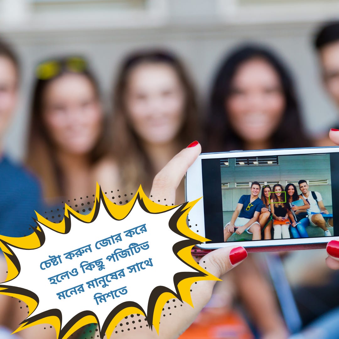 🌳 শিখুন কিভাবে নিজের চারপাশের পরিবেশ রক্ষা করতে হয়,আপনি কাদের সাথে ওঠাবসা করছেন, কাদের সাথে ঘোরাফেরা করছেন তারাও আপনার জীবনকে প্রভাবিত করে। আপনার চারপাশে যদি এমন মানুষ সারাক্ষণ ঘুরে বেড়ায় যারা সব সময় নেগেটিভ কথাবার্তা বলে, তাহলে একদিন আপনার নিজেরই এনার্জি কমে যাবে। তাই চেষ্টা করুন জোর করে হলেও কিছু পজিটিভ মনের মানুষের সাথে মিশতে। সাইকিয়াট্রিতে এই এফেক্টের নাম সোশ্যাল মাল্টিপ্লায়ার এফেক্ট।