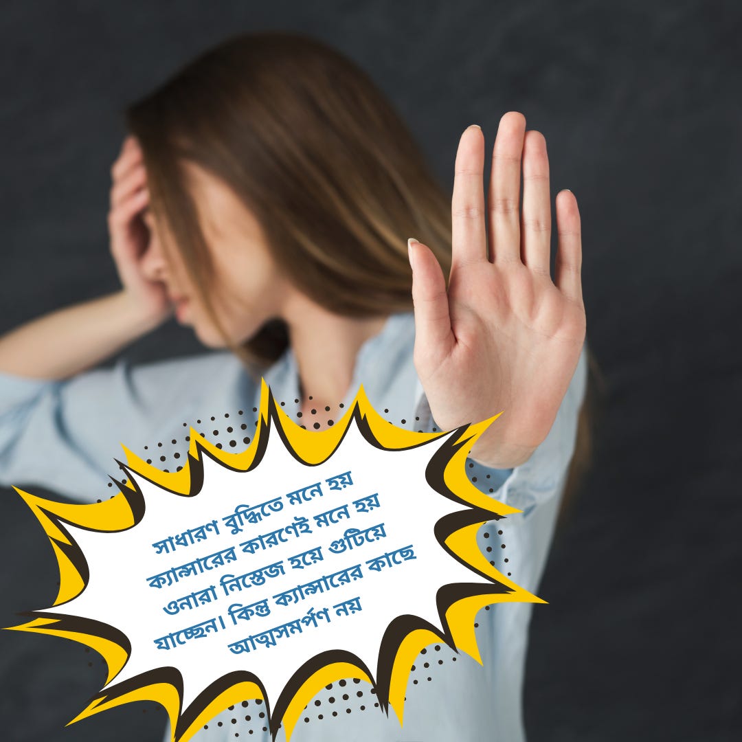 অথচ ডাক্তার হিসেবে প্রায়শই দেখি ক্যান্সার পেশেন্ট এমন ভাবে দিন কাটাচ্ছেন যেন তাদের কোন এনার্জি নেই। মোটিভেশনের অভাব।এর থেকে একের পর এক শুরু হয় নানা রকম প্রবলেম।