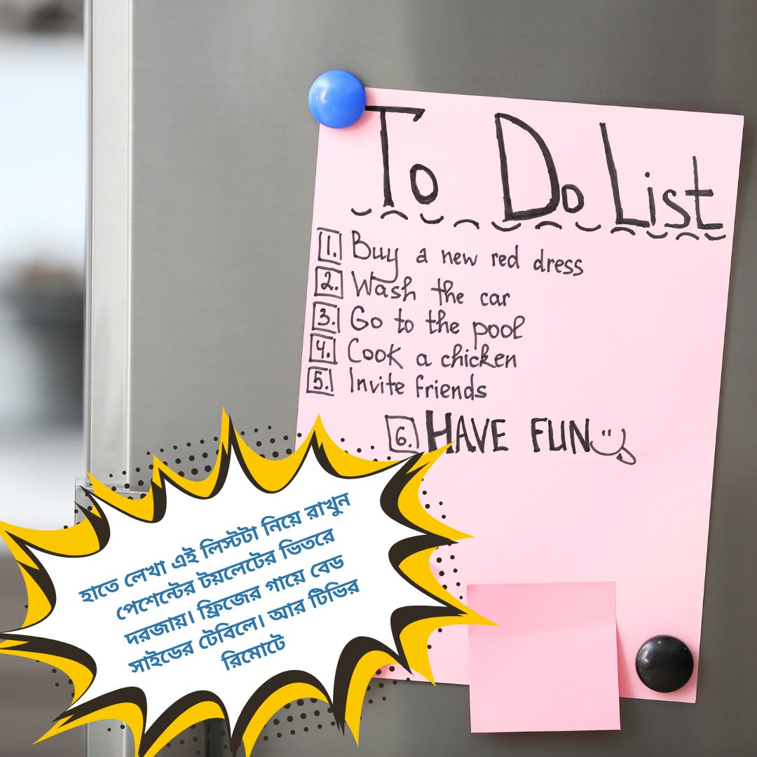 হাতে লেখা এই লিস্টটা নিয়ে রাখুন পেশেন্টের টয়লেটের ভিতরে দরজায়। ফ্রিজের গায়ে বেড সাইডের টেবিলে। আর টিভির রিমোটে।আস্তে আস্তে দেখবেন উনি কেমন এই সমস্ত অভ্যাস শুরু করেছেন। এই সমস্ত হ্যাবিটগুলো করতে গেলে ওনার ওপর মানসিক কোনো জোর প্রয়োগ করবেন না। ওনার সাথে লড়াই করারও চেষ্টা করবেন না। একদিন দুদিন বললে উনি যদি না শোনেন তাহলেও হাল ছেড়ে দেবেন না। প্রতিদিন একবার করে অন্তত বলুন, এই জিনিসগুলো করলে হতো না? আর আপনি যদি পেশেন্টের কাছে না থাকেন তাহলে দূর থেকে দিনের মধ্যে একটা অন্তত ভয়েস মেসেজ রেকর্ড করে হোয়াটসঅ্যাপে পেশেন্ট কে পাঠিয়ে দিন। এই অভ্যাস গুলোর আকুতির সাথে থাকুক মন ভালো করার আপনার নিজস্ব কিছু কথা। কিন্তু হ্যাঁ সেটা দৈনিক করতে হবে। তাহলে একদিন না একদিন পেশেন্ট শুনবেনই।