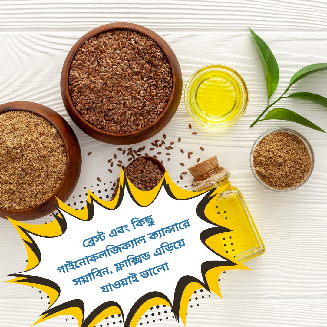 👉🏾 ব্রেস্ট এবং কিছু গাইনোকলজিক্যাল ক্যান্সারে সয়াবিন, ফ্লাক্সিড এড়িয়ে যাওয়াই ভালো। তার কারণ এর মধ্যে ফিমেল হরমোন থাকে প্রচুর। অতিরিক্ত ফিমেল হরমোনে বাড়তে পারে ক্যান্সারের রিস্ক।