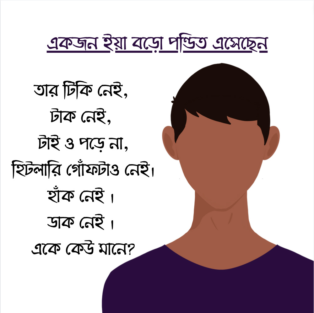 তার টিকি নেই, টাক নেই, টাই ও পড়ে না, মায় আপনাদের চুপিচুপি বলি, হিটলারি গোঁফটাও নেই। হাঁক নেই । ডাক নেই । একে কেউ মানে?