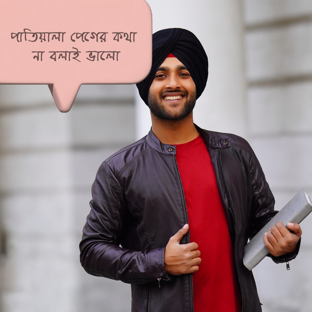 এই পাতিয়ালা পেগ, ইউরোপিয়ান পেগ এর থেকে অনেকটাই বড় মাপের। সেটা দিয়ে জাহির হতো যে রাজকীয় শিখদের লম্বা-চওড়া শরীরের সাথে সাযুজ্য রেখে রাজকীয় চালচলনের পরিমাপ হচ্ছে বিশাল মাপের পাতিয়ালা পেগ।
