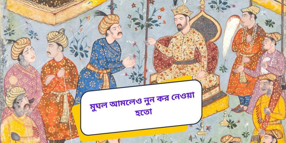 মুঘল আমলেও নুন কর নেওয়া হতো। এমন ভাবে নেওয়া হতো যে সেটা আজকের রাজনৈতিক বাতাবরণে একটা ডায়নামাইট হতে পারে, তাই আর আলোচনা না করাই ভালো।