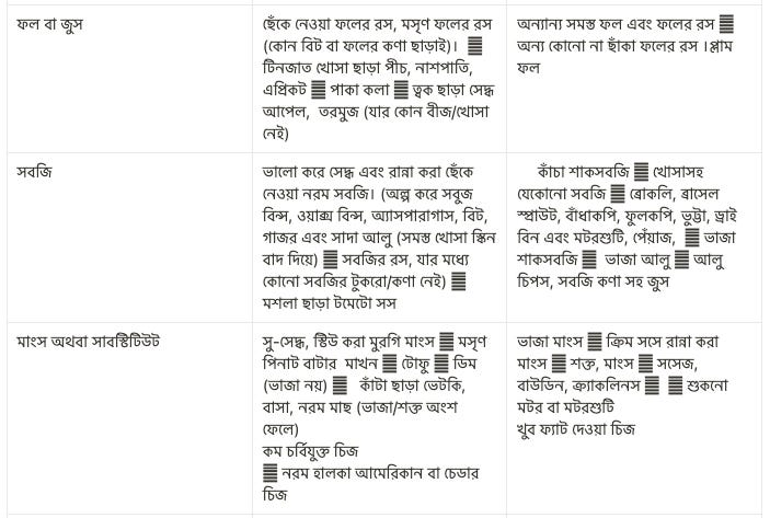 ফল খেলেও তার বাইরের খোসা ফেলে সেটাকে ভালো করে সেদ্ধ করে মিক্সিতে ম্যাশ করে খাওয়া দরকার। আবার এক্ষেত্রে সব ফল খাওয়া চলেও না। আটা জাতীয় খাবারের মধ্যেও মিশে থাকে অনেক ধরনের ফাইবার, সেগুলোও বারণ।