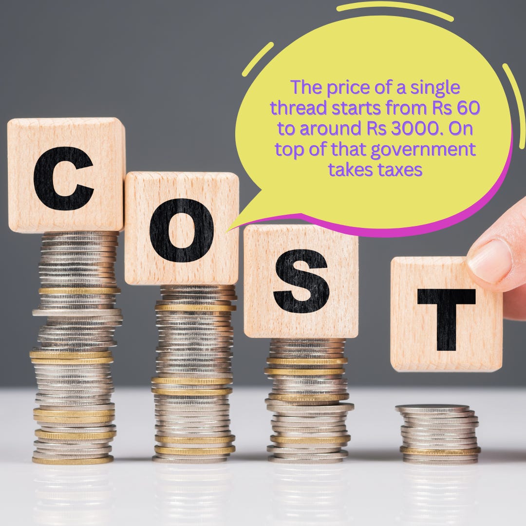 Each stitch has a different purpose. It also varies widely in price. The price of a single thread starts from Rs 60 to around Rs 3000. On top of that government takes taxes.