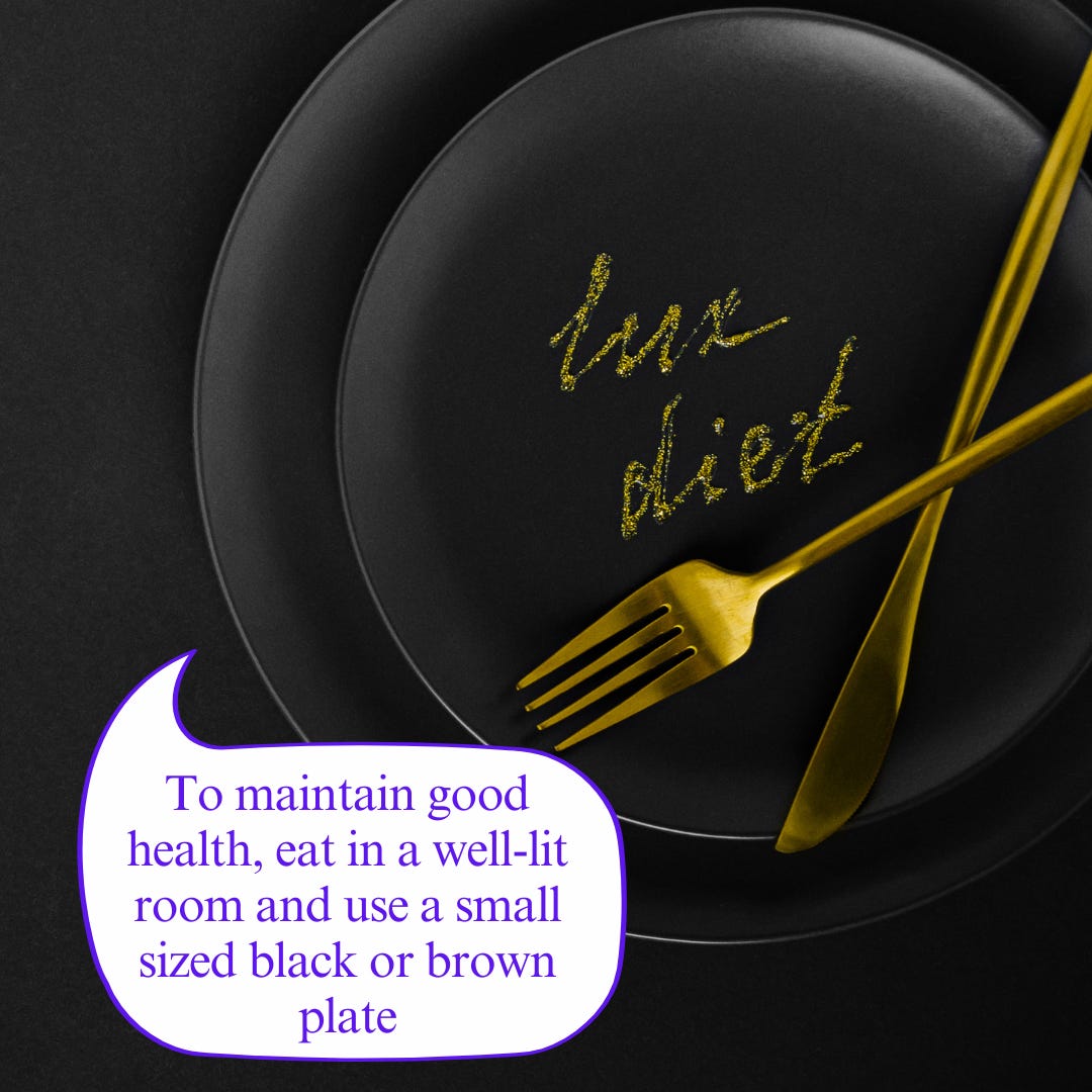 To maintain good health, eat in a well-lit room and use a small sized black or brown plate. Then, mind and stomach will feel fully fed, even with a small amount of food. We can escape from the trap of extra calories.